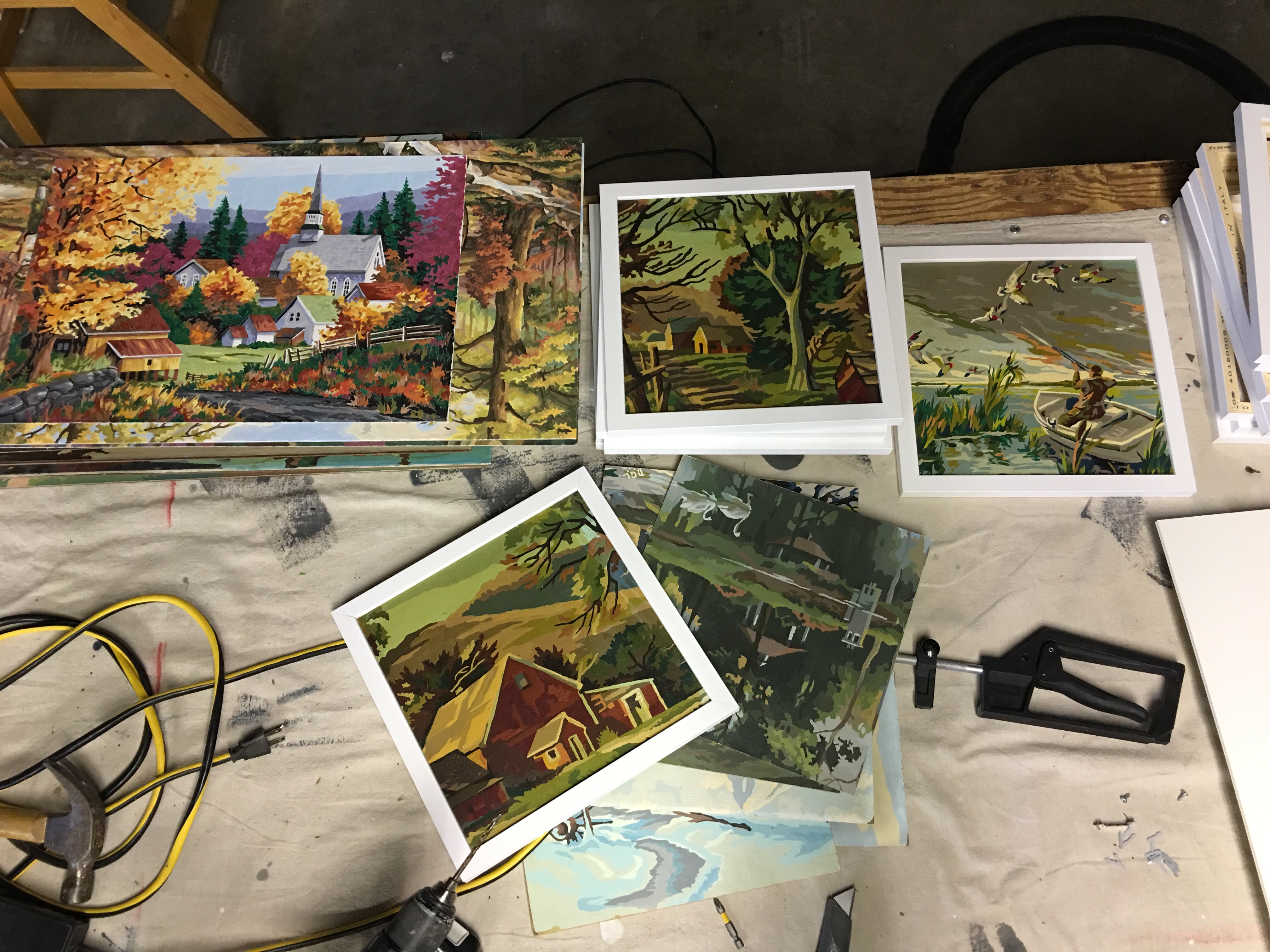 1- blue, 2- green, 3- brown… Posted on February 16, 2016 by peasant stock Over the years I’ve collected a few paint by numbers. I’m in the process of cutting them down and framing them all in the same wooden white frames, 11×11. I will hang them as an installation on one of the bedroom walls.